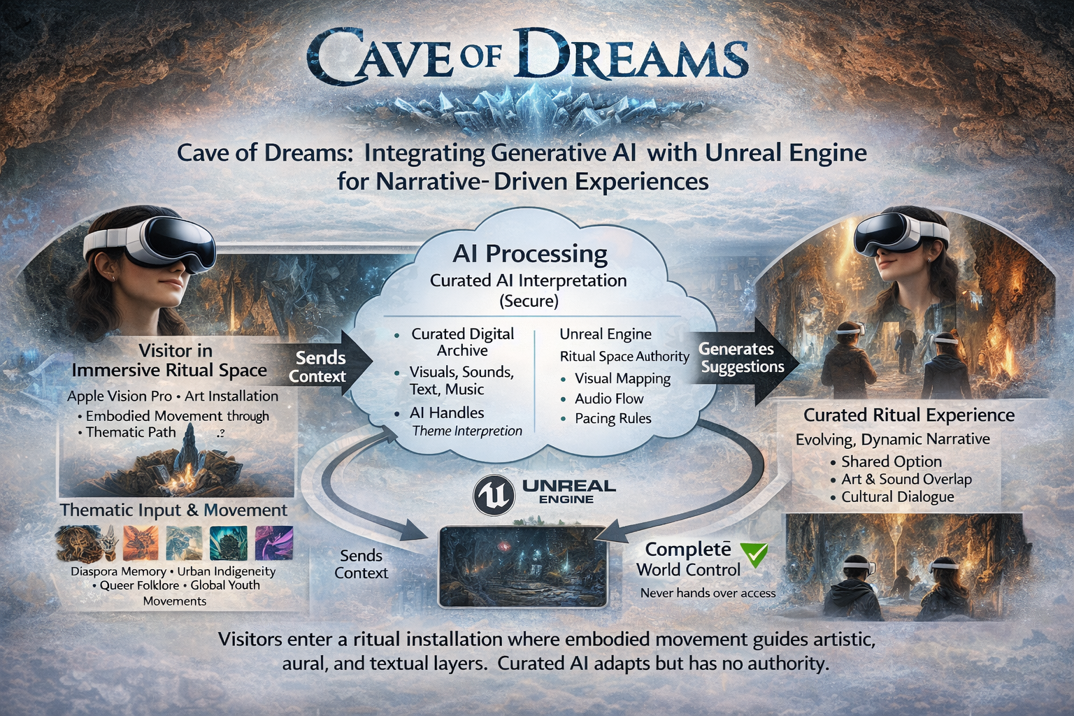 Cave of Dreams is an immersive installation offering an interactive visual and aural experience shaped by each visitor’s unique sociocultural background. Inspired by ancient ritual sites across the globe—including the painted caves of Lascaux and Chauvet, as well as Indigenous, African, Asian, Oceanic, and diasporic sacred spaces—Cave of Dreams honors the profound human tradition of encoding meaning into place, image, and sound.